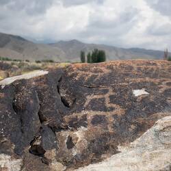Am Nordufer des Issyk-Kul-Sees besuchten wir das seit langem trockene Flussbett eines Gletscherflusses, wo die Saken, Skythen und andere Nomadenvölker im Zeitraum von ca. 800 v. Chr. bis 1200 n. Chr. Petroglyphen hinterlassen haben. Der Ort war damit eine Art Kunstgalerie unter freiem Himmel, mit wunderbarem Blick auf die Berge und den See.