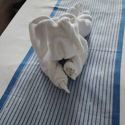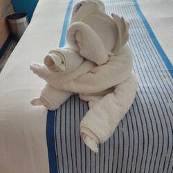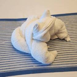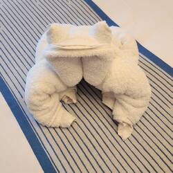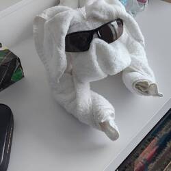 Our location when I woke up this morning, plus the towel animal of the day. He looks pretty good in sunglasses, don't you think?