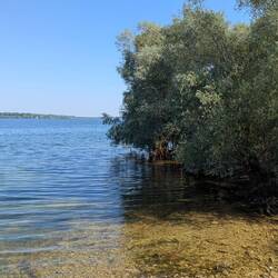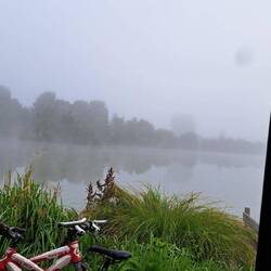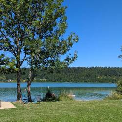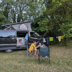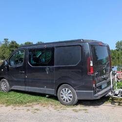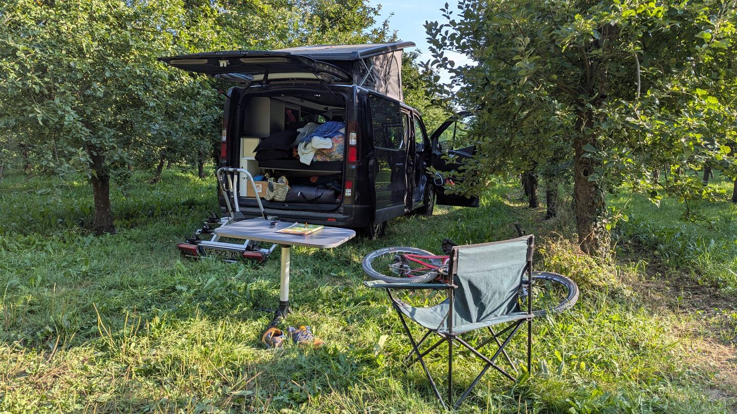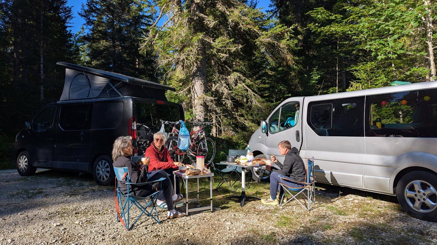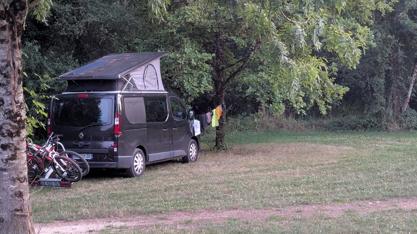 Au matin, on se rapproche du lac pour faire un tour de vtt. On découvre alors un beau spot, bien à l'ombre, avec pas mal de vans en place.