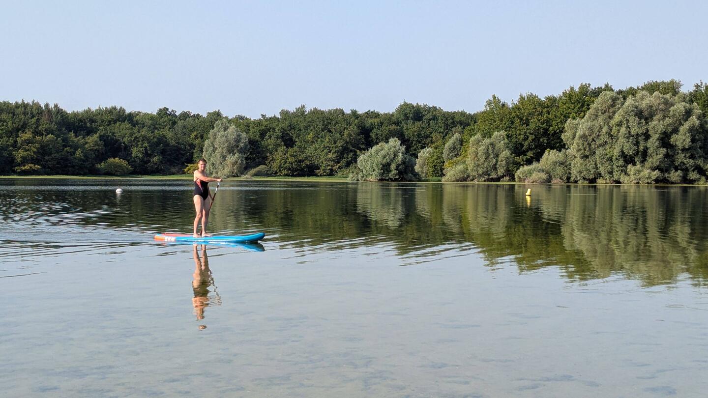 Ce matin, au lever direction le lac et un plouf agrémenté d'une ballade en paddle pour Nanny. On part...
