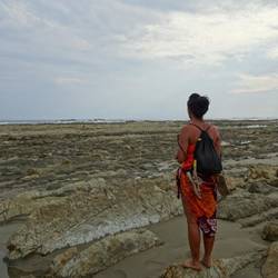 Mit Ella gehen ich nochmal zum Strand, diesmal ist Flut und von der Walfischflosse ist nichts mehr zu sehen. Überhaupt sieht der Strand jetzt ganz anders aus und das Wasser ist auch nicht so schönBaca lagi