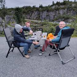 Super plac za večerjo pod zvezdami in med 🌲, zjutraj pa kar hitro dalje, ker nas dež ne spusti ven... Na Norveškem je baje 🌞, smer je torej prava 😀.