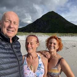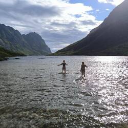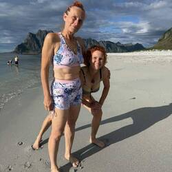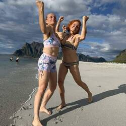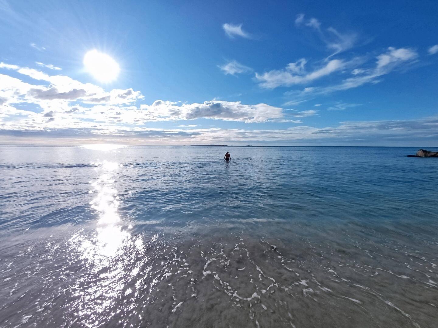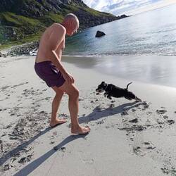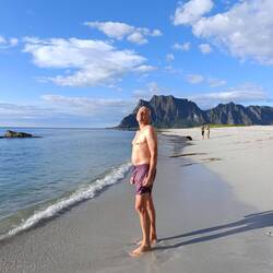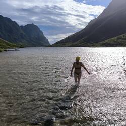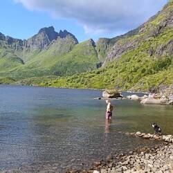 Ni kaj, če si na Lofotih in ob 18h še vedno žge sonce in si parkiran ob čudovitem sinjem morju, ti po kozarčku vina pridejo na misel vsemogoče neumnosti... Kot je kopanje v severnem Atlantiku vLes mer