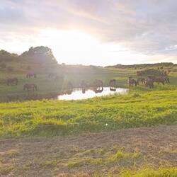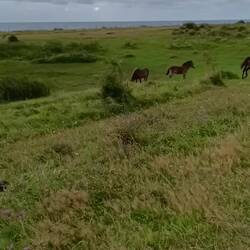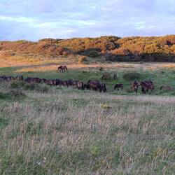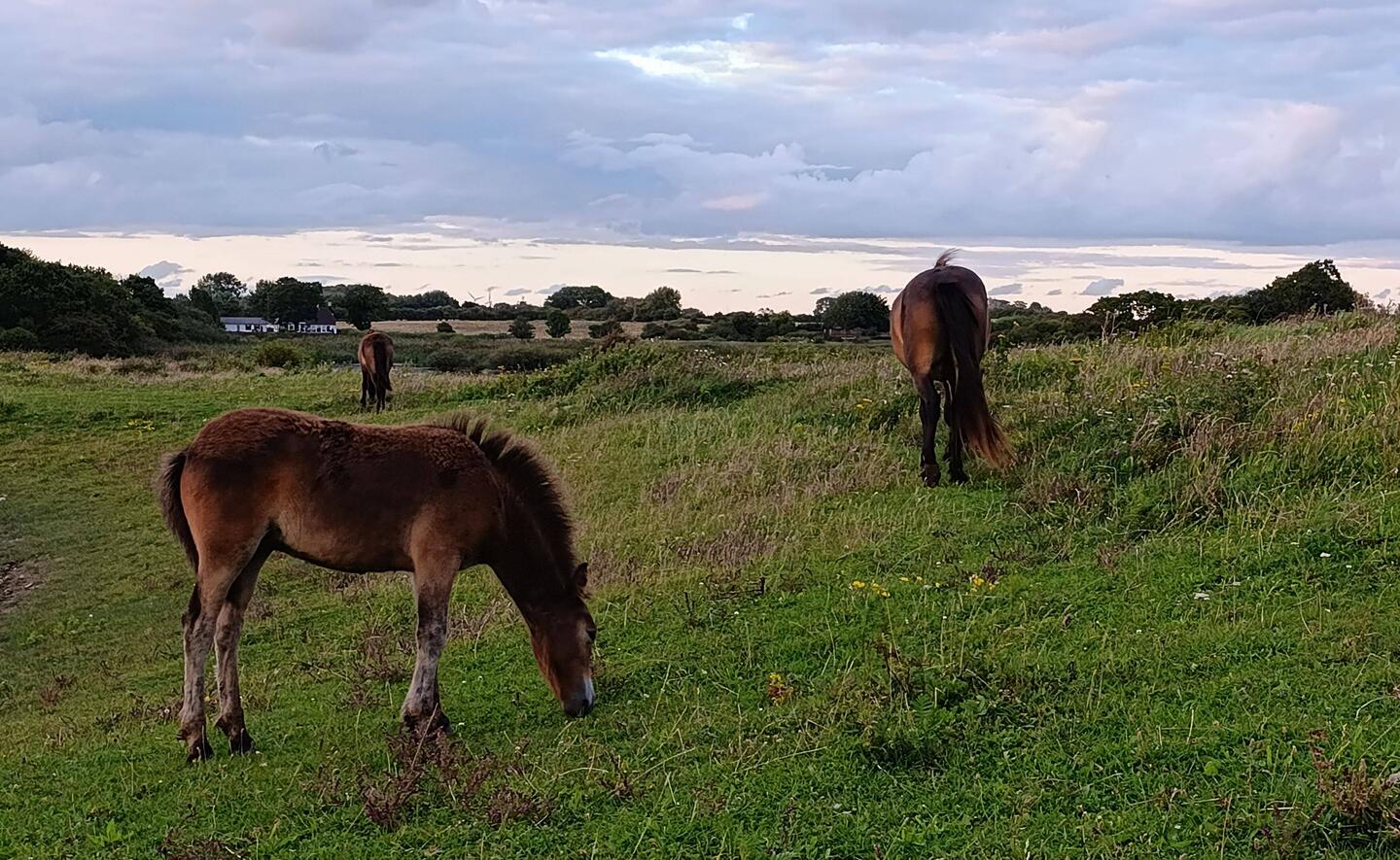 Na otočku Langeland še vedno, v nacionalnem rezervatu, živi trop divjih ponijev 🐎... Jih greva obiskat 😍. Prispeva ravno pravi čas za bahaški sončni zahod, opazujeva mlade ponije vLeggi altro