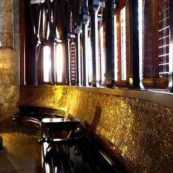 Auf dem Weg zur Sagrada ,ein T-Shirt und Graslollis für Vincent reicher, stehen wir - tatsächlich ungeplant - vor dem Palau Guell. Da kein hipper Laden mehr lockt, sind die Widerworte nicht sehr groß. Einmal Gaudi geht schon noch. Vincent fand die Ohrhörer gestern ziemlich gut nach eigener Aussage, aber "schon auch anstrengend" - "keinen Bock heute darauf"! Doch kaum sind wir am Einlass vorbei werden wir schon wieder technisch ausgerüstet, schon wieder was auf den Ohren, OK an den Ohren ;-) Ich gerate hin und wieder etwas durcheinander mit den Raumnummern und dem Audiotape - und siehe da, Vincent ist immer eine Unterstützung, weiß genau in welchem der schon wieder großartigen Räume er sich befindet und beschreibt mir unterstützend die Dinge, die er gerade gesehen und gehört hat;-) Bravo, die Jugend ist noch nicht verloren ;-)