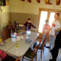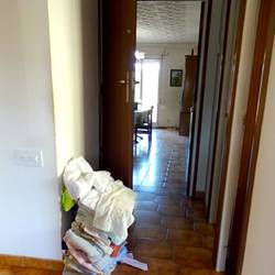 Da 2 Feiertage vor uns liegen, haben wir ausreichend Pasta, Pesto, Wurst, Schinken, Käse, Kaffee …… im Gepäck - eben für gemütliche, verdiente , ruhige 2 Tage in den Bergen, wie Carlotta bemerkt hat. Es sollte anders kommen. Noch während der Anfahrt auf den letzten 100 Metern staunen wir alle über ein großes, schickes mit Marmormosaiken geschmücktes Häuschen, freuen uns auf die nächsten Stunden. Nachdem Ulis erstinspiziert, folgen wir ihm mit Sack und Pack und Verpflegung. Eigenartige Gerüchte kannten wir schon von Tigerpalast. Was uns hier jedoch trifft, übertrifft jede negative Erwartung. Ulis Gesicht versucht noch inkognito durch das Haus zu laufen. Mir jedoch fällt das immer schwerer. Hier trifft alles aufeinander. Geruch trifft Schmutz trifft Schmuddel. Auf den ersten Blick seit Jahren unbewohnt. Staub liegt nicht nur in der Luft sondern fingertief auf allen Möbeln und Geländern. Der zweite berührungsfreie Blick in die Küche lässt jedoch einen Restekühlschrank entdecken. Die Kindernase erkennt faulen Fisch. Ich sehe alte Zwiebeln, Joghurt und diverses “was auch immer”. Die Kinder halten sich bisher in ihrem Urteil taktisch zurück, Vincent ist sprachlos. Und ich kann meinen Unmut nicht mehr zurück halten, schon gar nicht, nachdem ich die schmutzigsten Handtücher, Bettwäsche und “was auch immer ekliges Zeug” auf dem Boden gestapelt finde, darüber stolpere! Kein Bett ist bezogen und wenn doch, mit fleckigem Laken. Ich überlege, im Sitzen zu schlafen und denke darüber nach, welche Kleidung mich in der Nacht vor dem Ekel schützt. Vincent hat die gleichen Gedanken, ist aber immer noch sprachlos. Nachdem Uli den Besitzer telefonisch kontaktiert , und ihn freundlich ( ich wäre verbal geplatzt!) auf Schmutz und fehlende Bettwäsche hinweist, bittet er uns auf genau diese zu warten. Und der Ekel? Der Schmutz? Wo sind die Schutzanzüge für diese Bähbude? Ich hoffe auf keine Bettwäsche sondern nur auf Flucht! Ich versuche, nichts in diesem Haus zu berühren und meine Arme ganz eng an den Körper zu drängen, damit nicht allzuviel Ekelluft an mich gerät.