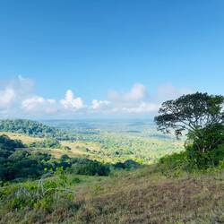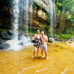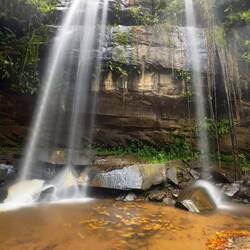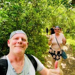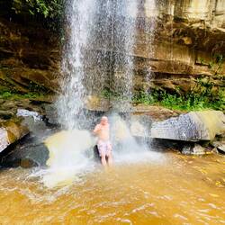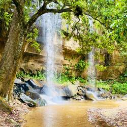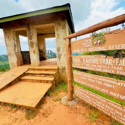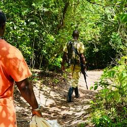Abstieg mit Abdalla und den Rangern durch sengende Hitze und den Regenwald zu den „nur“ 2,5 Km entfernten Wasserfällen mit 550 Höhenmetern unterschied…