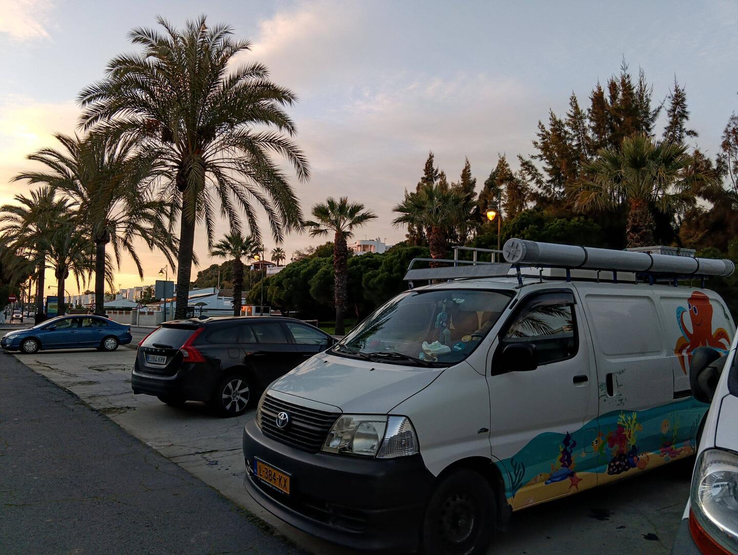 Na een camperplaats in de buurt van Huelva die gesloten bleek en een andere in Cartaya sta ik nu in Cartaya in een straat ingeparkeerd. De camperplek in Cartaya was prachtig op het strand, maar er stond helemaal niemand en dat voelde toch niet goed.