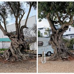 Er staan mooie oude olijfbomen op het terrein, maar door de grote hoeveelheid campers moet je goed kijken om ze te zien.