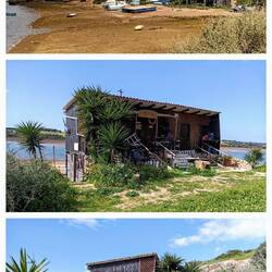 Over de boulevard met vele restaurantjes met terrassen naar een punt waar een bijzonder houten gebouw stond in een baai met drooggevallen bootjes. Daar zou ik nou wel willen wonen 😃