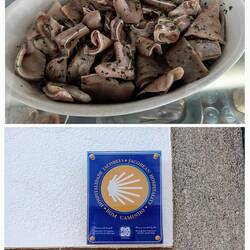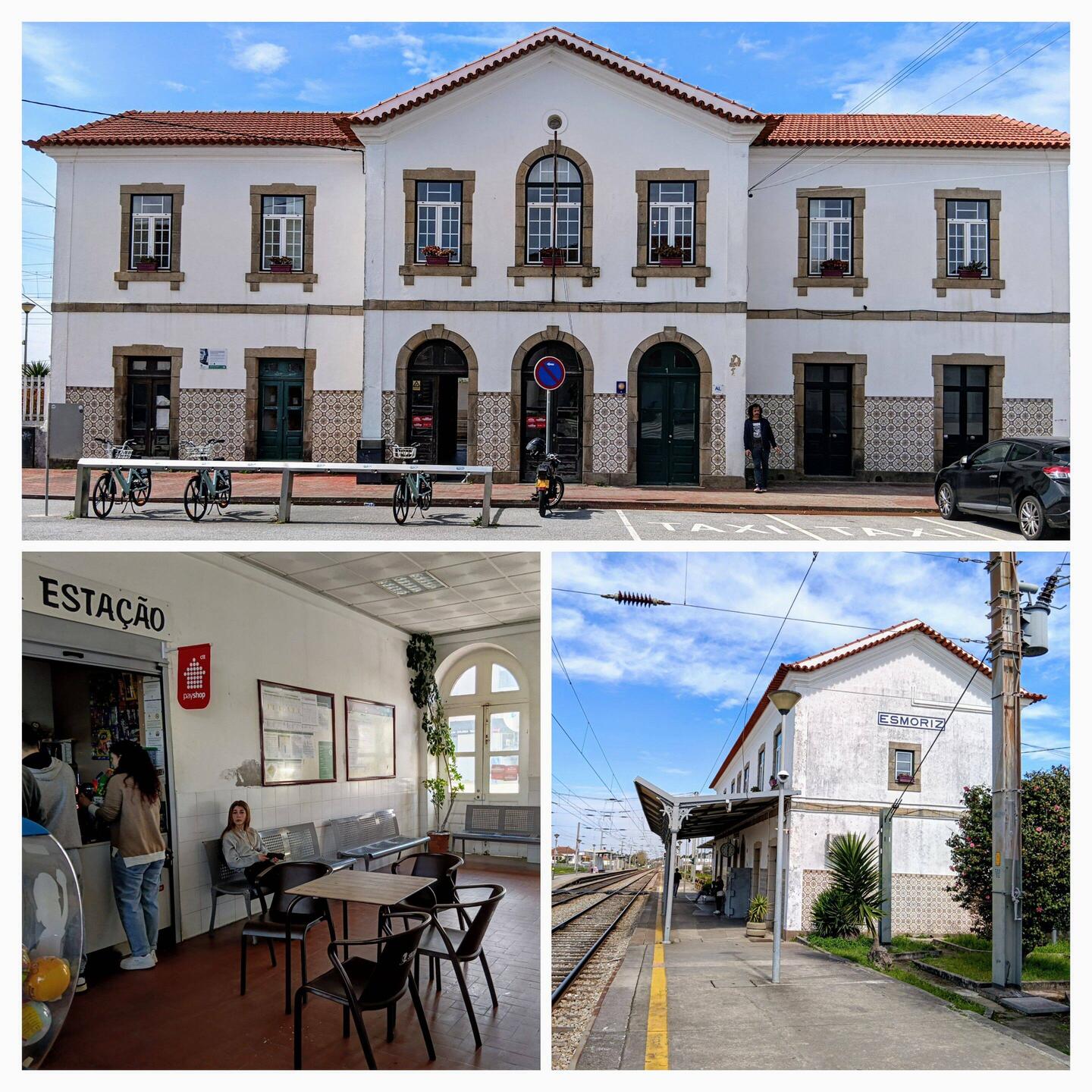Uitgestapt op het leuke stationnetje van Esmoriz, waar het bordje van de camino op stond, en even koffie gedronken in de bar ertegenover waar ze varkensoren als tapas hadden.