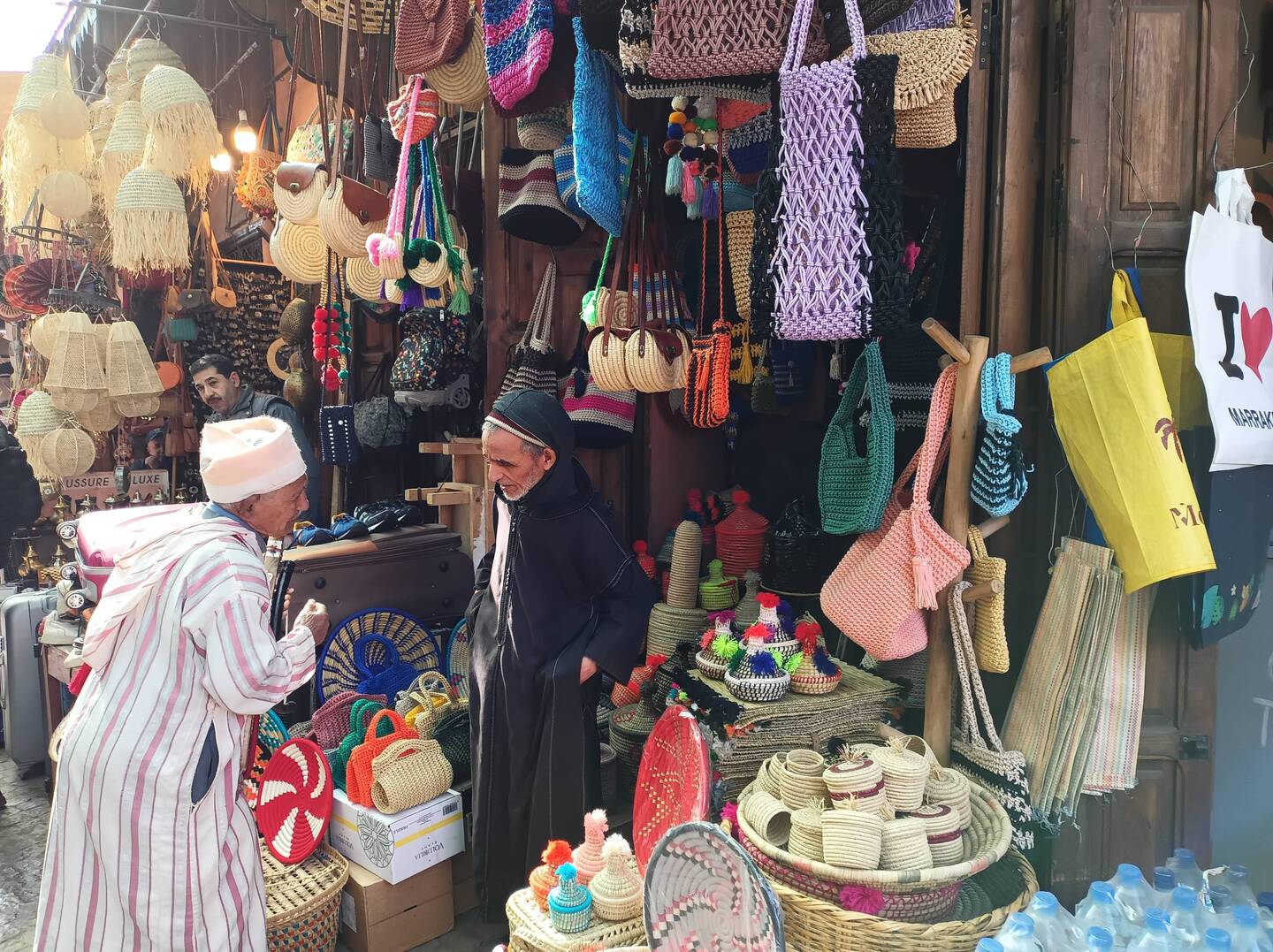 Ook waren er mannen die je een werkplaats lieten zien, zo ook bij mij. Er was een werkplaats waar iemand met een grote metalen spatel het leer aan de binnenkant zachter maakte. Er was een prachtige schaduw in de ruimte en terwijl ik stond te fotograferen voelde ik ineens iets tegen mijn tas aan. Ik keek en zag dat de andere man wel heel dicht bij mij stond en dat mijn tas niet meer dicht zat. Mijn portemonnee stak er bijna uit. Ik begon in het Nederlands met "ben je nou helemaal gek, dat ga je niet doen" en keek hem aan. Hij stoof weg en gek genoeg heb ik hem niet meer gezien. Alles was nog in mijn tas gelukkig, waarschijnlijk was het iemand die het zakkenrollen nog moest leren. Maar wel een vervelende ervaring.