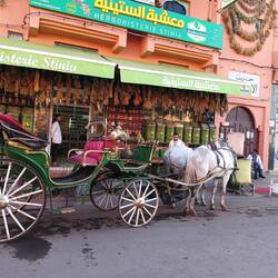 Het advies was om met koetsjes naar het stadje, naar de leerlooierij, te gaan omdat er geen taxis bij de camping kwamen volgens de beheerder van de camping. Zijn familie zal wel in de koetsjes handelen 🤣