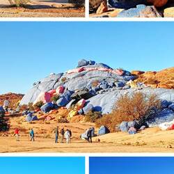 De eerste stop was bij gigantische rotsformaties die geschilderd zijn in de kleuren blauw, roze en geel door de Belgische kunstenaar Jean Vérame (geboren in 1936 in België). Het is onderdeel van een project waarmee hij hele delen van de woestijn met verf bedekte. Zo heeft hij de landschappen van de Sinaï in Egypte, de Anti-Atlas in Marokko, het Tibesti-massief in Tsjaad en de Atacama-woestijn in Chili getransformeerd, moeilijke/tegenstrijdige gebieden, die hij wilde verzachten door middel van een esthetische impuls.