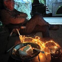 Berend komt vragen of we uit eten gaan, maar iedereen is zijn potje aan het koken. Ik nodig Berend uit voor soep met brood en camembert.