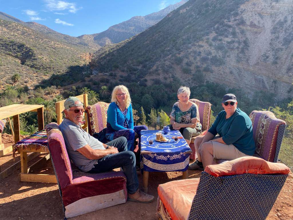 Koffie in een klein tentje met groot terras in de oase. En een zeer uitgebreide 3-gangen lunch.