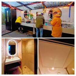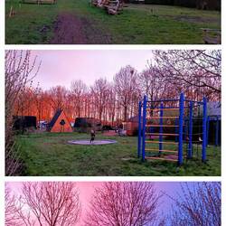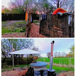 Rond 18.00 uur kwam ik daar aan, wat een leuke camping zeg!!! Er stonden campertjes, caravans, tenten, huisjes, Tipi's en overal hingen lampjes en werden er vuurtjes gestookt. Een sauna en een hottub, trampoline en skelters. Hun motto is "alles is van iedereen" en zo voelt de camping ook.