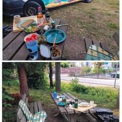 Intussen was het al 15.00 uur en heb ik besloten om naar Sankt Martin te rijden, een heel mooi plaatsje in het wijngebied. Bij de camperplaats aangekomen was die al helemaal vol. Er stond een picknickbank aan de zijkant en daar kon ik mooi met mijn Octobus bij staan vind ik. Even eieren koken en een lekkere salade eten met Duits zuurdesembrood, de scheurbuik is weer op afstand gezet 😃