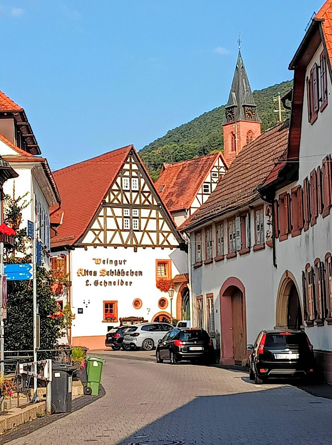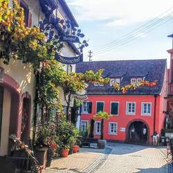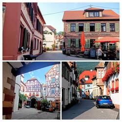 Als je in de buurt van Sankt Martin komt dan is het echt een bezoek waard. Het is een heel oud stadje, met prachtige (vakwerk)huizen helemaal in het teken van de wijn. Wijnranken langs de huizen, gespannen over de straten, overal gezellige terrassen en wijnproeverijen.
