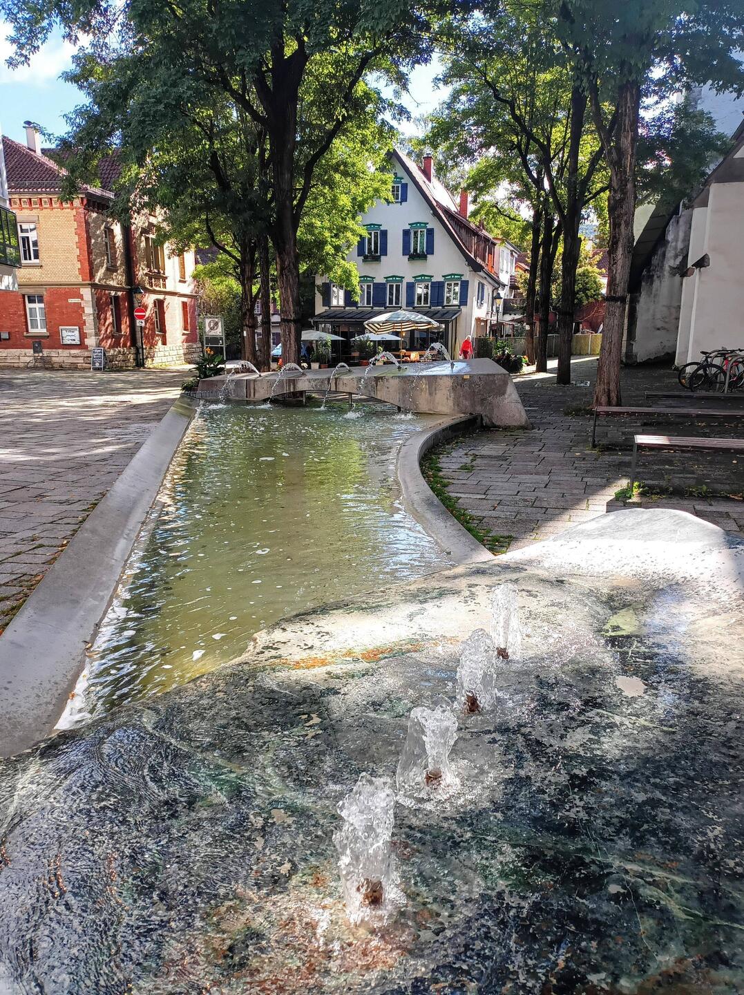 Vanmorgen lekker vroeg naar het stadje, ditmaal door de borden Altstadt te volgen. Zonder verdwalen kwam ik in het oude gedeelte terecht. Oude straten waar een kanaaltje langs de mooie oude huizen loopt, lekker genieten met het zonnetje erbij. Koffie drinken in een leuk alternatief tentje dat vroeger het badhuis van het stadje was geweest. Het oude bad was in tweeën gezaagd en daar was een zithoek van gemaakt. Gehaakte kussentjes voor op de stoelen en oosters aandoende kleedjes op de tafels. Alles met liefde en zorg samengesteld, zelfs tot in het toilet, ongebleekt bruin toiletpapier, allerhande menstruatie artikelen, kast met echte handdoekjes ipv papieren handdoekjes. De koffie is Fairtrade en de taarten zelfgebakken. Een feestje om hier te zitten.