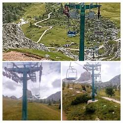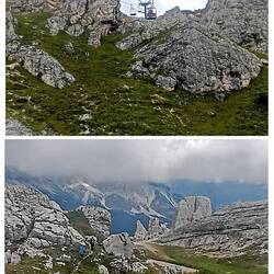 Daarna naar Rufugio Fedare, waar de kabelbaan naar boven gaat. Bij het intypen van de bestemming kreeg ik een code rood alarmfase voor hevig onweer. Oh nee toch dan gaat de kabelbaan misschien niet vandaag. Bij de kabelbaan zeiden ze dat het onweer morgen pas kwam, dus gerustgesteld heb ik een retourtje gekocht. Adembenemend mooi om in de stilte in zo'n stoeltje te zitten, de koele bergwind door je haren en de panorama's voorbij te zien komen, ik had er wel een uur in willen blijven.