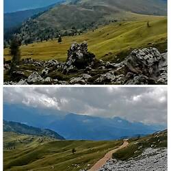 Vanmorgen weer op pad om naar het begin van de hike te komen. Dat bleek bijna onmogelijk omdat er overal aan beide zijden van de weg autos geparkeerd stonden en er echt geen plekje voor mij over was. Toch maar weer terug gereden net zo lang tot ik een plekje gevonden had. Dat was al weer een aardig eindje van het beginpunt af. Maar plotseling kwam ik bordjes tegen waarvan er één naar rif. Nuvolau verwees, slechts 1.40 u en 5.3 km. Dat leek me wel wat, maar wat was dat afzien, het was een heel klein olifantenpaadje dat steil omhoog ging. En omdat het gisteren nogal veel geregend had was het best glad. Omdat ik mijn stokken in de rugzak heb die Kittie mee gaat nemen miste ik houvast. Ik had wel de paraplu meegenomen die ik gebruikte als een soort stok, maar die was zo laag dat ik het er van in mijn rug kreeg. Daar kwam nog bij dat ik gisteren al een beetje duizelig was en dat is op een steile helling ook niet bevorderlijk. Toen ik ook nog grote druk op mijn hoofd voelde besloot ik dat het niet verstandig was om deze hike vandaag te doen. Ik ben nog steeds een stukje naar boven gelopen en dan weer even zitten totdat ik bij een pad uitkwam dat horizontaal het olifantenpaadje kruiste. Daar was er een bordje, 1.20 u naar rif. Nuvolau, er stond geen km meer bij. Maar de andere kant op was het 10 minuten naar een andere Rifugio die aan de weg ligt. Dat was een goed idee. Lekker buiten op het terras koffie drinken en kijken naar de bonte mengeling van wielrenners, motorrijders en hikers wat daar allemaal samenkomt om iets te drinken en te eten. Dit is de Colle Santa Lucia en is een waar Eldorado voor de wielrenners en motorrijders met al zijn bochten.