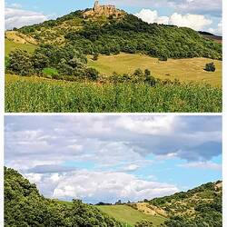 Natuurlijk eerst weer op zoek naar koffie. Op Google Maps kon ik niets vinden, maar dat geloofde ik niet en besloot te gaan lopen naar het stadje. Allereerst maar naar de toeristeninfo, daar konden ze de kerk en de wein- und steinlehrweg aanbevelen. Op de vraag of ik ergens koffie kon krijgen was het antwoord bij Café Zauber bij het park even buiten het stadje. Nou dat was dan gelijk een leuke wandeling dacht ik nog. Aangekomen bij Café Zauber waren ze gesloten wegens familie omstandigheden, ik hoop maar dat het iets leuks was en niets ernstigs. Maar wel ernstig was dat het al later en later werd en ik nog geen koffie gevonden had. Ja wat nu? Naar de Octobus terug en zelf koffie zetten? Nee hoor het zal toch wel lukken om ergens koffie te krijgen? Bij een prachtig hotel ben ik binnen gelopen en heb verteld dat cafe Zauber gesloten was en gevraagd of ik bij hen koffie kon kopen. Gelukkig was de uitbaatster zelf aanwezig, te herkennen omdat zij als enige geen uniform droeg, want de receptioniste schudde al nee, maar kreeg van haar bazin de opdracht om mij te vergezellen naar de bar, waar ik voorzien werd van een heerlijke grote kop koffie en alweer taart, dit keer frambozen/yoghurt. Het hotel is een kasteel geweest, dat kun je goed zien bij de entree want die is in de toren.