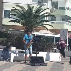 Terug lekker over de boulevard langs het strand waar iemand muziek stond te maken. Wat is dat een lekker sfeertje zeg. Ik had plotseling behoefte aan het nummer sitting on the dock of the bay omdat dat ook zo'n relaxt sfeertje heeft. En dat nummer kon hij voor me spelen, wat heerlijk. Voor wie het leuk vindt om te horen