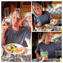 Ja en daar kwam Franco, de Italiaanse buurman weer aan, bezweet op de fiets. Hij had ook boodschappen gedaan voor het eten, een groot stuk zalm, champignons, sla liet hij zien voor goedkeuring. Ja wat kun je daar op zeggen? Meer dan goed natuurlijk. Ik had gezegd dat ik liever niet zo veel vet wilde eten ivm te hoog cholesterol en hij had precies eten gehaald dat daar goed voor was.