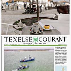 Terug over het plein en daar de tweede koffie op een terras, tegenover een vestiging van het bedrijf van een nichtje en haar man 'Divine Home', genietend van de digitale Texelse Courant, wat een heerlijke relaxte dag.
