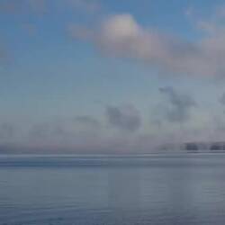 Es ist so schön, wie sich die Sonne und Wolken im Wasser spiegeln. Im Horizont steigt der Dampf über dem Wasser auf und wird zu Wolken.