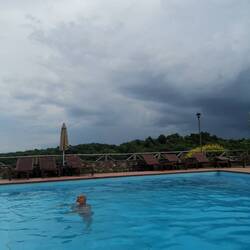 Unsere Unterkunft, das "La Loggia Villa Gloria", 3 Sterne liegt etwas außerhalb in Macialla. Ein wirklich tolles Anwesen und wie immer werden wir freundlich empfangen. Über Siena braut sich ein Gewitter zusammen und wir nutzen die Zeit um uns schnell noch im Pool zu erfrischen. Einfach herrlich. Im Pool schwimmen und Blick auf die breite der Toskana zu haben. Unser Abendessen ist eher einfach gehalten. Ein Focaccio mit Frischkäse, Toskanasalami, einem Pecorino Romano Käse, Erdbeeren und dazu eine Flasche Chianti. Pecorinokäse schmeckt schon lecker , aber der Romano ist da eher nicht unser Geschmack. Wir testen weiter.