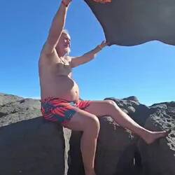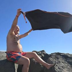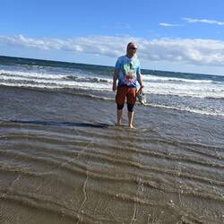 Wir verabschieden uns von Scott und gehen zurück zum Hotel. Umziehen und dann geht es noch ans Meer. Heute ist es zwar windiger als gestern, aber einmal baden muss sein. Ich bin der erste der in die Fluten springt und Sonni traut sich dann doch nur bis knapp zur Hüfte, die kleine Frostbeule. Wenn man erst einmal drin ist, ist es wirklich sehr angenehm und so bleibe ich auch eine Weile. Sonni sitzt lieber am Strand und sonnt sich.