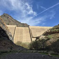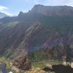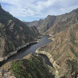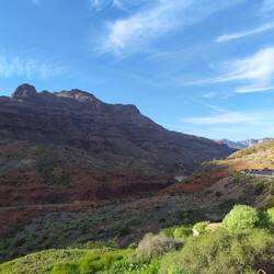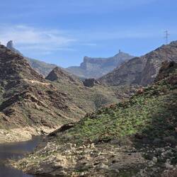 Wir diskutieren darüber wie wir weiter fahren. Sonni würde den Weg zurück nehmen, aber ich finde das doof. Denn dann sehen wir alles nochmal, nur anders herum. Länger, aber sicher auch interessanter, ist der Weg über die GC 210 nach Tejeda. So machen wir es dann auch. Aus dieser Richtung wird die Straße etwas unebener. Das hat aber auch einen Vorteil. Die Radfahrer fahren scheinbar die Strecke nicht so gerne. Das Grün nimmt zu und zwischen den Kleinpflanzen recken Palmen und Kakteen ihre Köpfe in den Himmel. Das Grün wird malerisch von den rotbraunen Felswänden durchzogen. Es geht hoch und runter, die Straße wird eng. Es ist ruhig hier oben in den Bergen und die Aussichten sind phänomenal. Wir machen an einem Staudamm Halt bevor es eine Serpentine hinauf geht, ala Bergetappe der Tour de France. Ich liebe solche Fahrten, eng an den Felswänden vorbei mit immer wieder engen Kurven. Für Sonni ist das alles nichts, daher will ich auch eine Pause einlegen. Ich denke das tut Sonni gut. Am Staudamm ist es kühl, herrlich.
