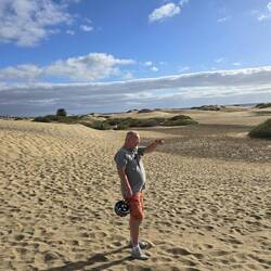 Richtung Playa del Ingles geht es und dann an der Promenade weiter bis zu den Dünen von Maspalomas. Also eins kann man sagen, die Möglichkeit hier zu verhungern und verdursten ist gering. Dazwischen sind immer wieder die Souvenirläden mit halbwegs dem gleichen Angebot. Aber es ist ein anderes Treiben als gewohnt. Es ist etwas vor 12 Uhr und die Bars sind gut gefüllt. Ich trinke auch mal gerne ein Bier, aber gleich nach dem Aufstehen ist mir dann doch zu hart. An anderer Stelle wird getanzt und das Leben ist hier ausgelassen. Die Sonne kämpft noch etwas, aber sie schafft es die Wolken zu vertreiben und so haben wir dann zwischenzeitlich knapp 25 Grad. Besser geht es ja gar nicht im Winter.
