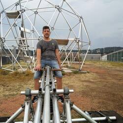 Während ich auf dem Dach werkle, schraubt Christian mal eben die Solarzellen am Arbeitstisch fest. Na, eigentlich könnten wir den ja morgen dann einfach aus der Halle schieben, um Solarstrom zu erzeugen ;-).