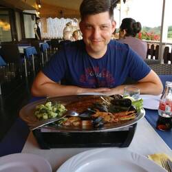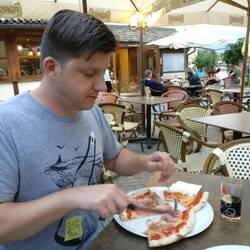 Georg nimmt (standard) irgendwas mit Pilzen und Tomatensauce ich esse eine der Spezialpizzen, die den dritten Platz bei irgendeiner Pizzaweltmeisterschaft gemacht haben.
