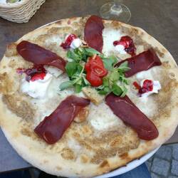 Tomatensauce, Trüffelpaste, Brie, (der weltbeste) Mozzarella, Vogerlsalat, Kirschtomaten und Hirschschinken, das ganze mit Preiselbeeren garniert.