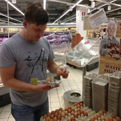 Wir kaufen Brot mit maßgeschneiderten Schutzhandschuhen und füllen (fast bio-) Eier in niedliche kleine Viererpäckchen ab (eigentlich bräuchten wir ja im Moment gar keine Eier, aber die Packungen sind einfach zu nett 😉 ).