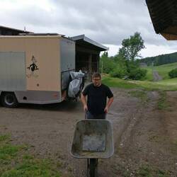 Helmar nadelt noch schnell den Anhänger, dann packen wir auch dieses Werkzeug ein, das muss auch mit.