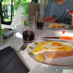 Heute frühstücken wir Mal hinterm Haus – der Tag verspricht, sauheiß zu werden wir messen um 9:00 Uhr schon knapp 30 Grad.