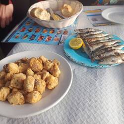 Sirve el plato típico de Málaga: espeto de sardinas. Consiste en sardinas frescas asadas. Lo acompañamos con un platillo denominado adobo: pescado frito apanado adobado con ajos. Bebidas: CervezaRead more