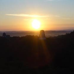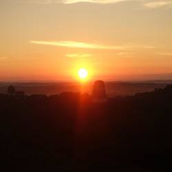 Ich taste mich nach dem Licht, aber nix passiert. Ja klar, hier gibt es Strom nur zu ausgewählten Zeiten, was ich schon wieder vergessen hatte. So taste ich mich mit Stirnlampe zunächst ins Bad und dann zum Treffpunkt mit meinem Guide. Wer mich kennt weiß, dass es sehr gute Gründe geben muss, mich um diese Zeit aus dem Bett zu holen. Der heutige ist der 🌅 über Tikal. Um 4:00h starten wir (6 Touristen und unser Guide) durch die stock dunkle Nacht. Der schœnste Platz für den Sonnenaufgang liegt im Norden der Anlage von Tempel IV. Der Aufstieg ist anstrengend, insbesondere da unser Guide ein straffes Tempo anschlägt. Wir sind die zweite Gruppe, die ankommt, setzen uns auf die Tempelstufen und genießen die Stille. Mit dem ersten Morgengrauen melden sich die Brüllaffen weit aus dem Wald. Dann erhebt sich langsam die Sonne, unkommentierbar... einige französische Touristen trödeln noch ein, aber nach wie vor sind wir weit weniger als 50 Personen vor Ort, so dass ich den atemberaubenden Sonnenaufgang in seiner vollen Schönheit genießen kann.