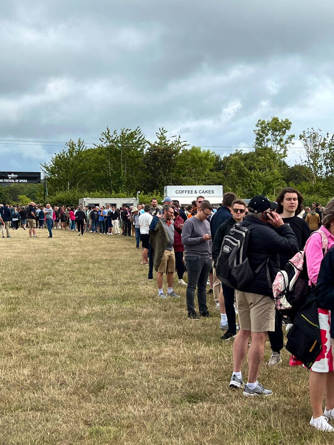 We are in for a long wait. In the queue to collect our tickets for the Festival of Speed.
