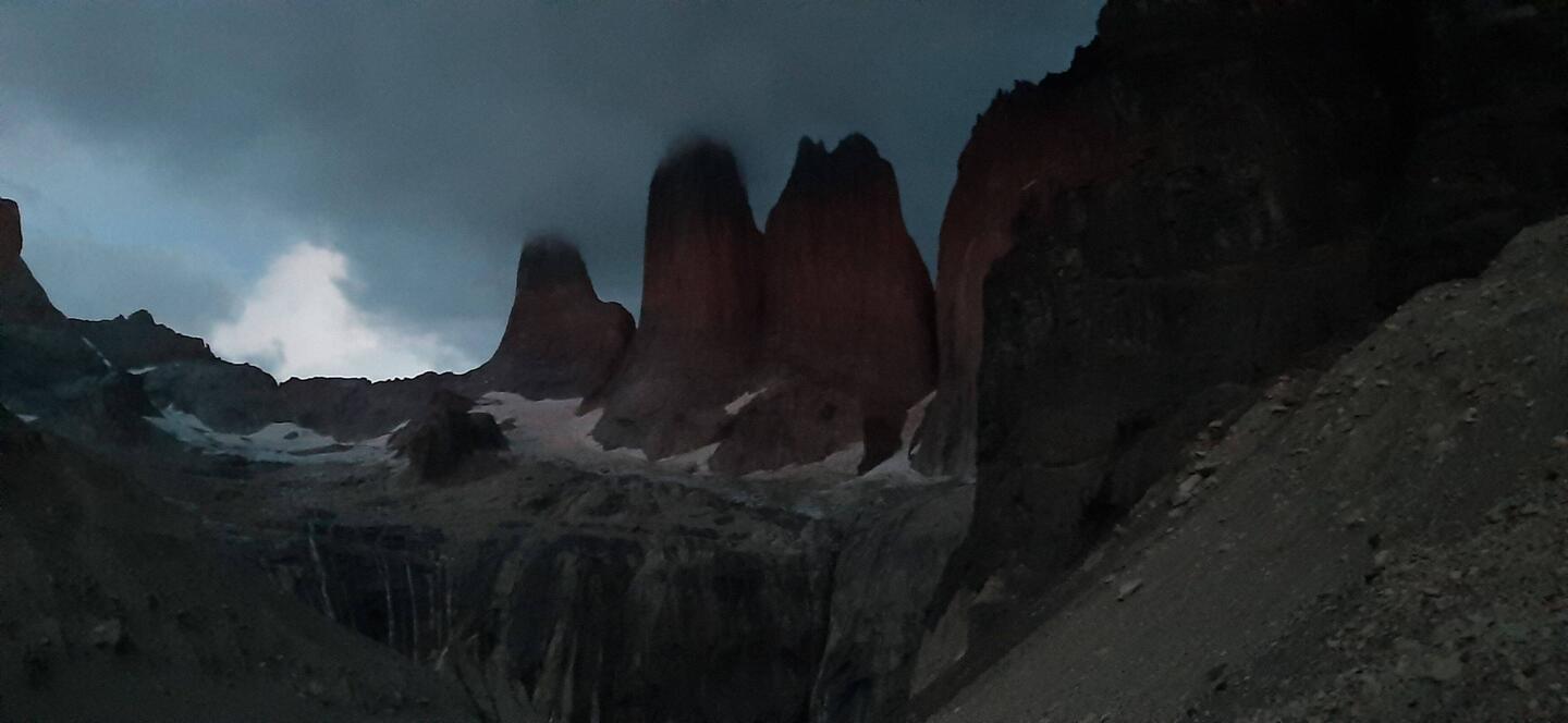 Der Wecker klingelte bereits kurz nach 3, denn zum Sonnenaufgang heißt es oben angekommen zu sein. Gut 11 Kilometer mit 900 Höhenmetern galt es zu bewältigen, ohne zu wissen, ob wir auf der Hälfte umdrehen müssen. Wir quälten uns raus und starteten pünktlich, sahen sogar schon wenige Stirnlampen vor uns den steilen Weg herauf kraxeln. Stockduster stiefelten wir also nach oben und erreichten bald auf halber Höhe das Camp Chileno (welches leider voll gebucht war, sonst wären wir da gestern schon hingewandert). Dort war dann tatsächlich ein Absperrband mit "Aufstieg gesperrt", aber wie alle anderen kletterten wir drüber. Wir kamen gut voran und meisterten auch die letzten Geröllfelder in der Morgendämmerung. So hatten wir sogar noch eine gute halbe Stunde Puffer bis zum Sonnenaufgang. Das war gar nicht so schön, denn so saßen wir bei wenigen Grad über Null und pfeifendem Wind in dem Schatten eines Felsens und warteten auf das Naturschauspiel. Tatsächlich hatten wir Glück und die Wolken ließen die Sonne durch und wir sahen die Türme in Rot / Gold erscheinen.