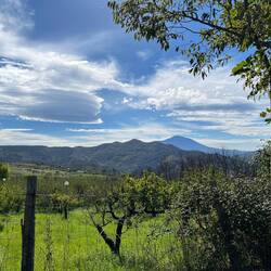 Так поступово ми заїхали в крихітне старовинне містечко в горах, і так воно нам сподобалось, що ми вирішили лишитись тут на ніч. Зупинились на порожньому кемпінгу з неймовірним видом на гори і на Етну, над якою куполом лежали хмари.