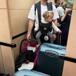 Вже біля гейту я знайшла стометрівку, вільну від рекламних екранів, яскравих кіосків та музики. Після десяти хвилин протесту, донечка нарешті заспокоїлася та заснула у мене в ергорюкзаку. Я вдягла їй беруші, і повернулась до Марка. На посадку разом із нами чекали ще дві пари із дітьми, трішки старшими за Альму. Було дуже цікаво спостерігати за ними.
