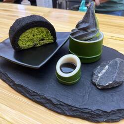 Потім пішли шукати щось поїсти, і Марк запропонував скуштувати матча-набір, який він запримітив ще вчора. Ми взяли морозиво з елітного сорту матча та з бамбукового вугілля, рулет із матча-кремом, тепле мʼяке печиво із моші начинкою, теплий матча-чай та матча з льодом та сирною пінкою 🤔 Це був неповторний вибух різноманітних текстур, нюансів смаків та дуже мʼякий ніжний смак матча. Фантастично! А доня скуштувала перше в її житті морозиво, у них було три види без цукру.