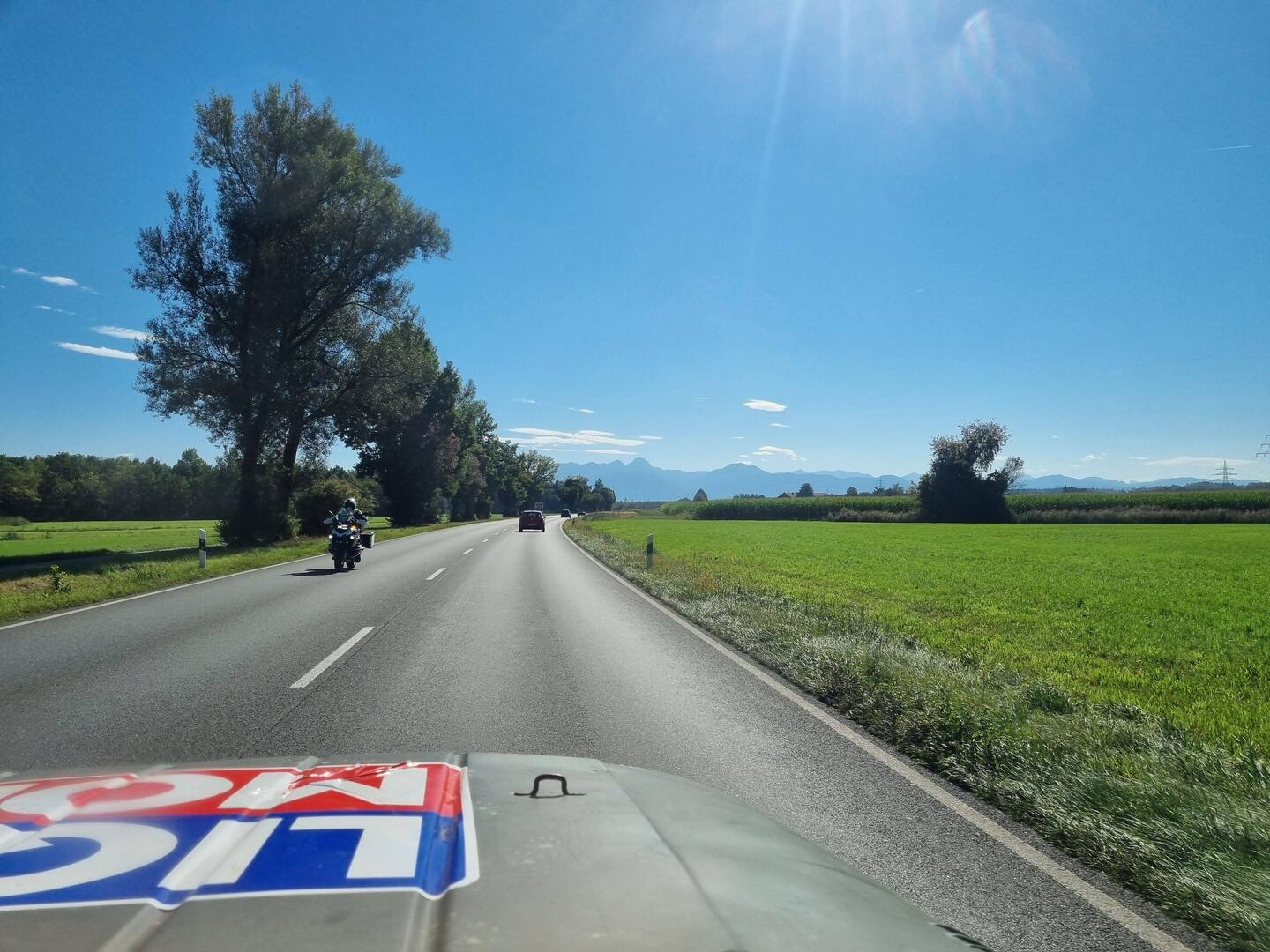 Nach der Reparatur beim Team BesserVisser geht es nach Rosenheim. Unterwegs können wir dann auch schon die ersten Berge sehen.