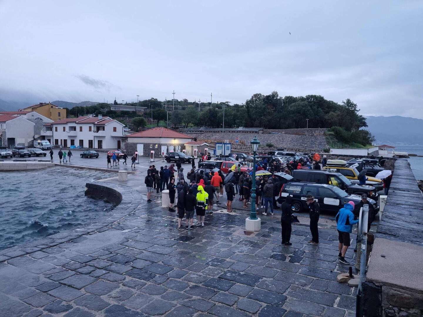 Unsere Wetterapps warnen heute vor erheblichen Regen mit Erdrutschen. Und auch das Briefing in Senj findet schon im Regen statt.